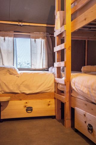 The tent features a thoughtfully designed layout, including a cozy double bedroom with ample cot space, as well as a second bedroom with a single bunk bed and an additional single bed.