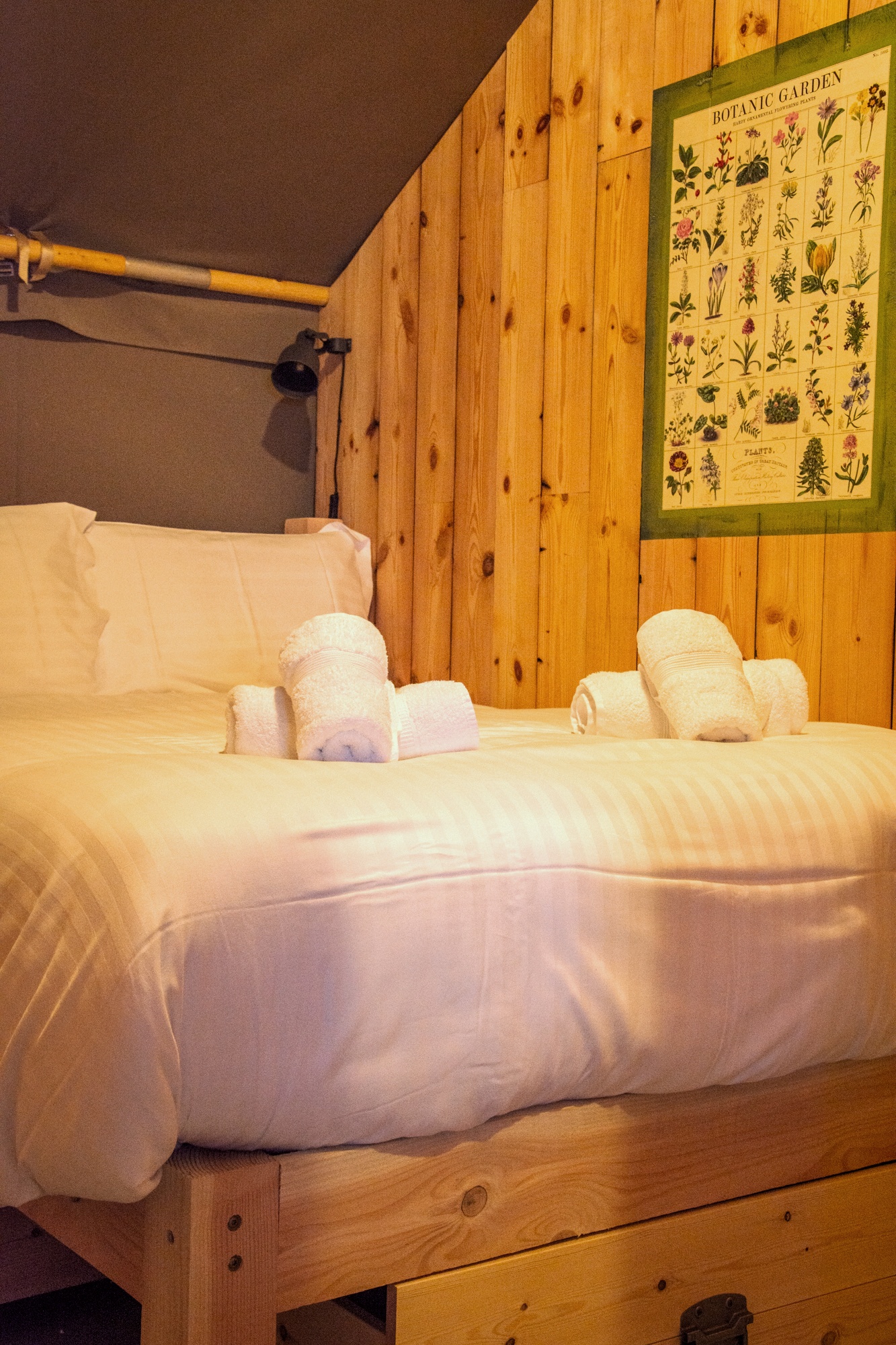 Step into the exquisite interior of our Glamping Sunflower Safari Tent, providing the ideal base for your next adventure.