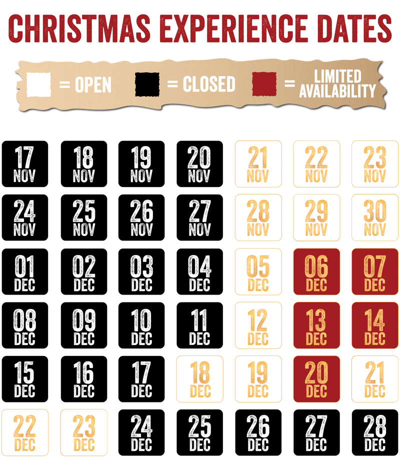 Please note: All Father Christmas Experience ticket holders have access to the Farm Park and the activities included within your ticket from 9:30am. The Farm Park will close at 7pm, so please arrive in time to complete the activities!
