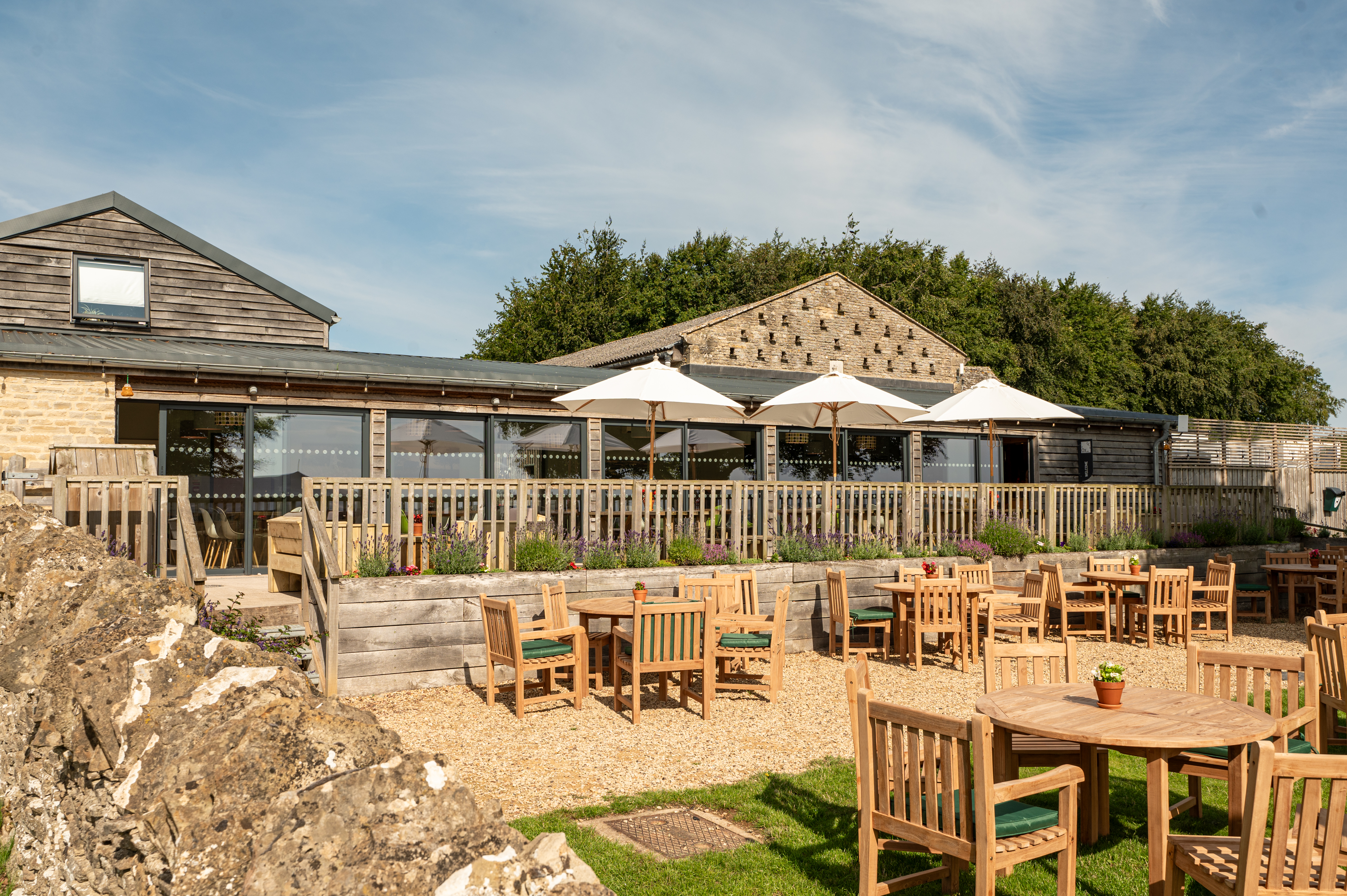 Our team has taken great care to create a space that not only captures the essence of traditional farm buildings but also minimises waste and embraces sustainability. As you step foot in The Ox Shed, you'll notice the charming British green oak featheredge boarding, the characterful corrugated tin roof, and the Cotswold stone recycled from the old hovel building that once graced the park's outdoor seating area.